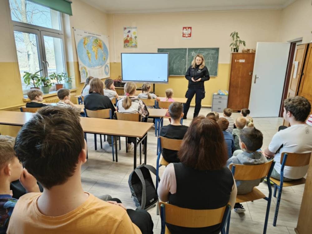 Dbając o bezpieczeństwo naszych uczniów w czasie zbliżających się ferii zimowych, 13 lutego odbyło się spotkanie profilaktyczno-edukacyjne z panią policjantką. Podczas prelekcji funkcjonariuszka przypomniała dzieciom o zagrożeniach mogących pojawić się w trakcie ferii. Szczególnie skupiła się na omówieniu zasad bezpieczeństwa podczas uprawiania sportów zimowych oraz gier i zabaw na świeżym powietrzu. Przypomniała również zasady postępowania wobec nieznajomej osoby. Dodatkowo uświadomiła dzieciom, do kogo mogą zwrócić się o pomoc w przypadku zgubienia się w obcym miejscu, np. na stoku narciarskim. Uczniowie mogli przypomnieć sobie, jak należy się zachować, jeśli staną się świadkami zdarzeń, w których zagrożone jest ludzkie życie oraz pod jakie numery należy dzwonić, aby uzyskać potrzebną pomoc. Ważnym elementem spotkania była także rozmowa o przestrzeganiu zasad poruszania się po drogach, szczególnie po zmroku, kiedy niezbędne stają się elementy odblaskowe.