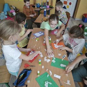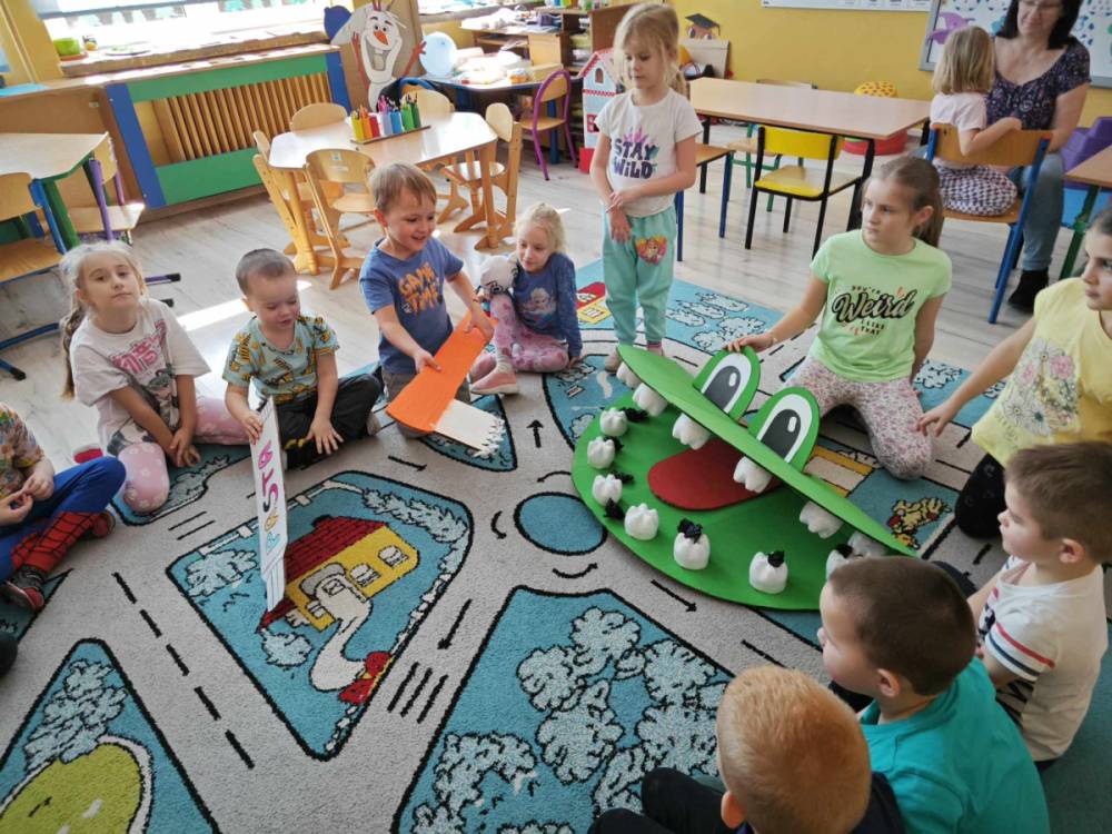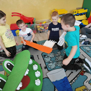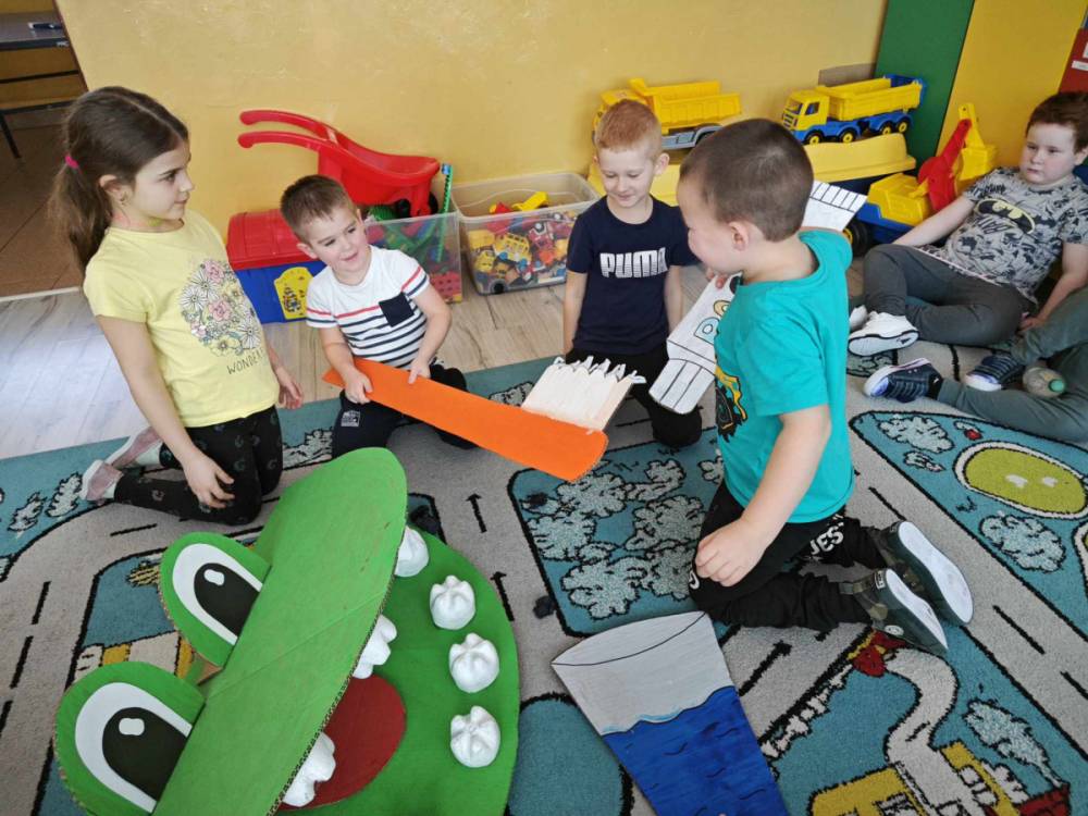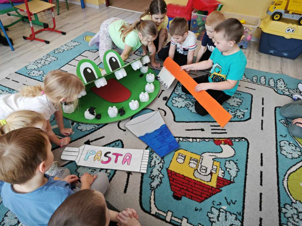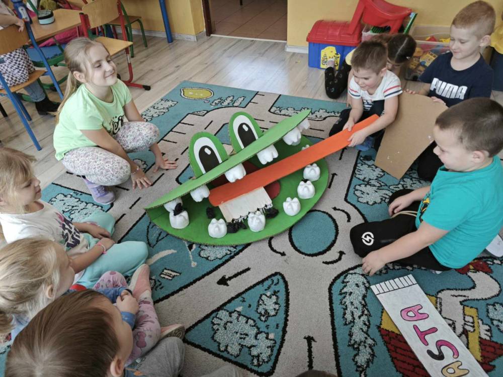 Pierwszy tydzień marca to doskonały czas na obchody Dnia Dentysty. Nasi uczniowie przygotowali paszczę diplodoka z wielkimi zębami, która posłużyła w pogadance na temat higieny jamy ustnej i przełamywania lęku przed wizytą u stomatologa. Dzieci wzięły udział w edukacji na temat nazw zębów, ich budowy i ilości a koniec wykonały pracę plastyczną, wesołe, białe ząbki.