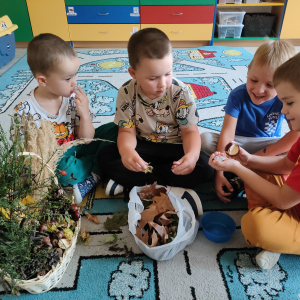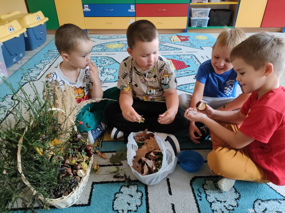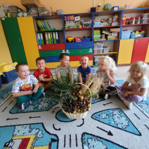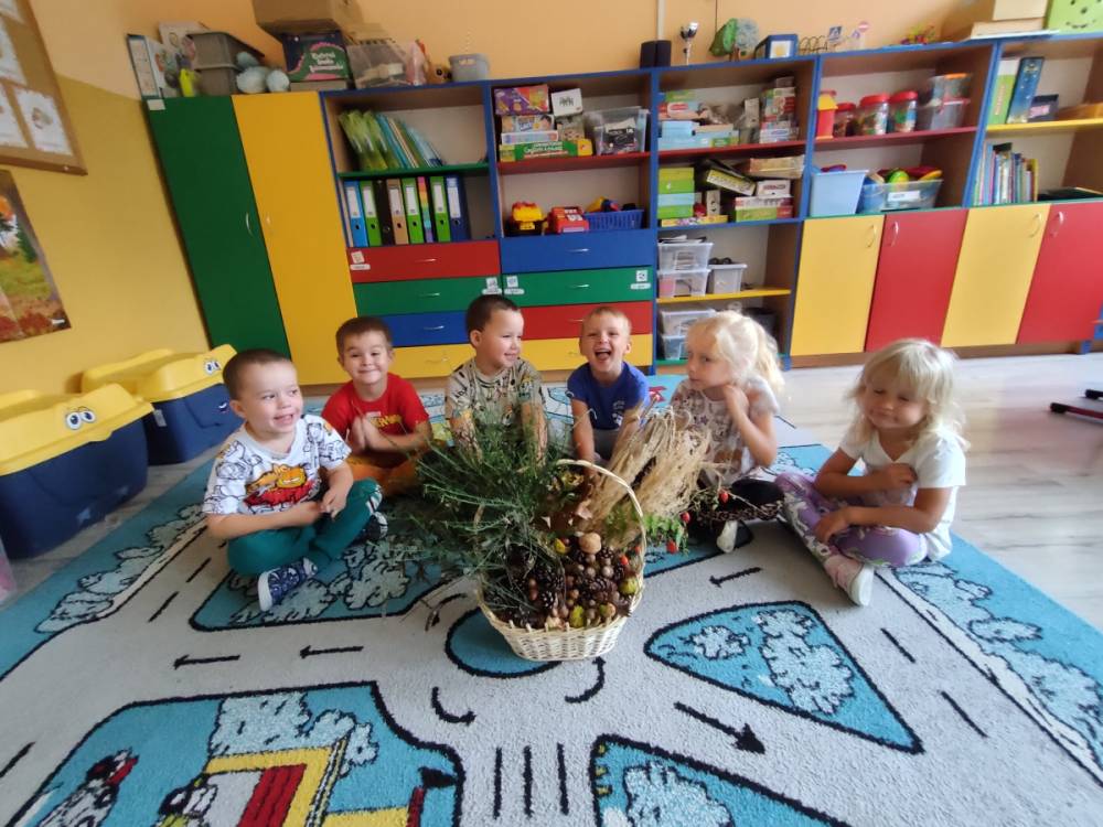 Nasza najmłodsza grupa powitała jesień w wyjątkowy sposób - tworząc przepiękny koszyk pełen darów tej kolorowej pory roku. Dzieci wraz z rodzicami z ogromnym zaangażowaniem przyniosły wspólnie nazbierane skarby jesieni: kasztany, żołędzie, szyszki, kolorowe liście, orzechy i inne naturalne cuda. Ten dzień był nie tylko pełen uśmiechu, ale także nauki. Najmłodsi poznawali nazwy jesiennych darów, ich cechy i znaczenie w przyrodzie. Wspólna aktywność dostarczyła wszystkim wiele radości i była pięknym wstępem do dalszych jesiennych przygód.