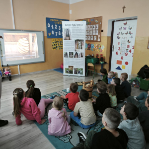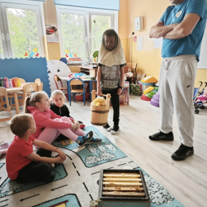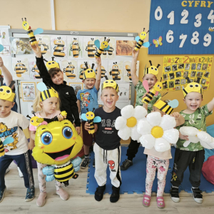 W związku z powyższym 20 maja w naszej szkole obchodziliśmy Światowy Dzień Pszczół. Obchody tego święta mają na celu podnoszenie świadomości przyszłych pokoleń na temat znaczenia pszczół dla środowiska oraz rolnictwa. Z tej okazji zaprosiliśmy do naszej szkoły wyjątkowego gościa Pana Mirosława Kasperczuka. Dzięki uprzejmości miejscowego pana pszczelarza uczniowie mieli możliwość poznania tajników związanych z życiem pszczół oraz produkcją miodu. Dzięki opowieściom naszego gościa dzieci zdobyły wiele cennych informacji i ciekawostek. W trakcie opowiadania poznały fascynujący świat tych owadów. Dowiedziały się, dlaczego pszczoły tańczą, ile kwiatów muszą odwiedzić, aby zebrać kropelkę miodu, czego się uczą w pszczelim przedszkolu, czym się żywią oraz jak spędzają zimę. Miały także możliwość obejrzeć przybory, których używa pszczelarz w swojej codziennej pracy oraz skosztować pysznego miodu prosto z ula. Panu Mirosławowi serdecznie dziękujemy, były to bardzo ciekawe zajęcia, które na długo pozostaną w pamięci dzieci.