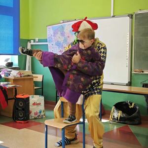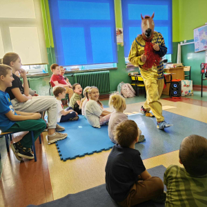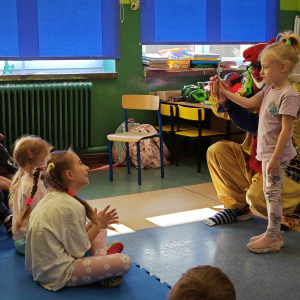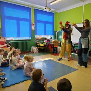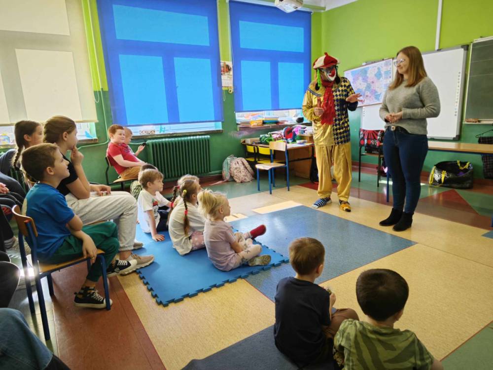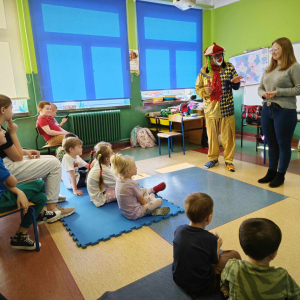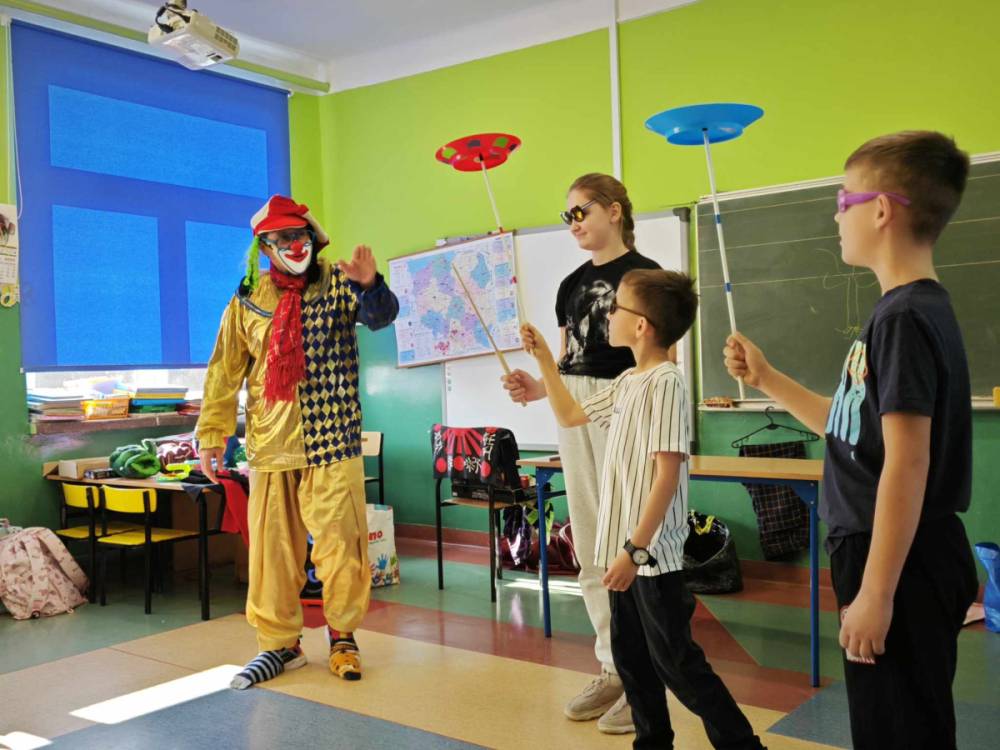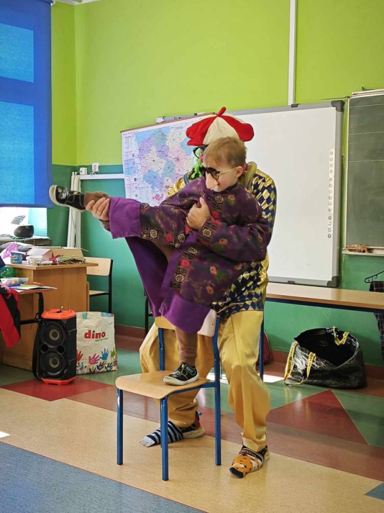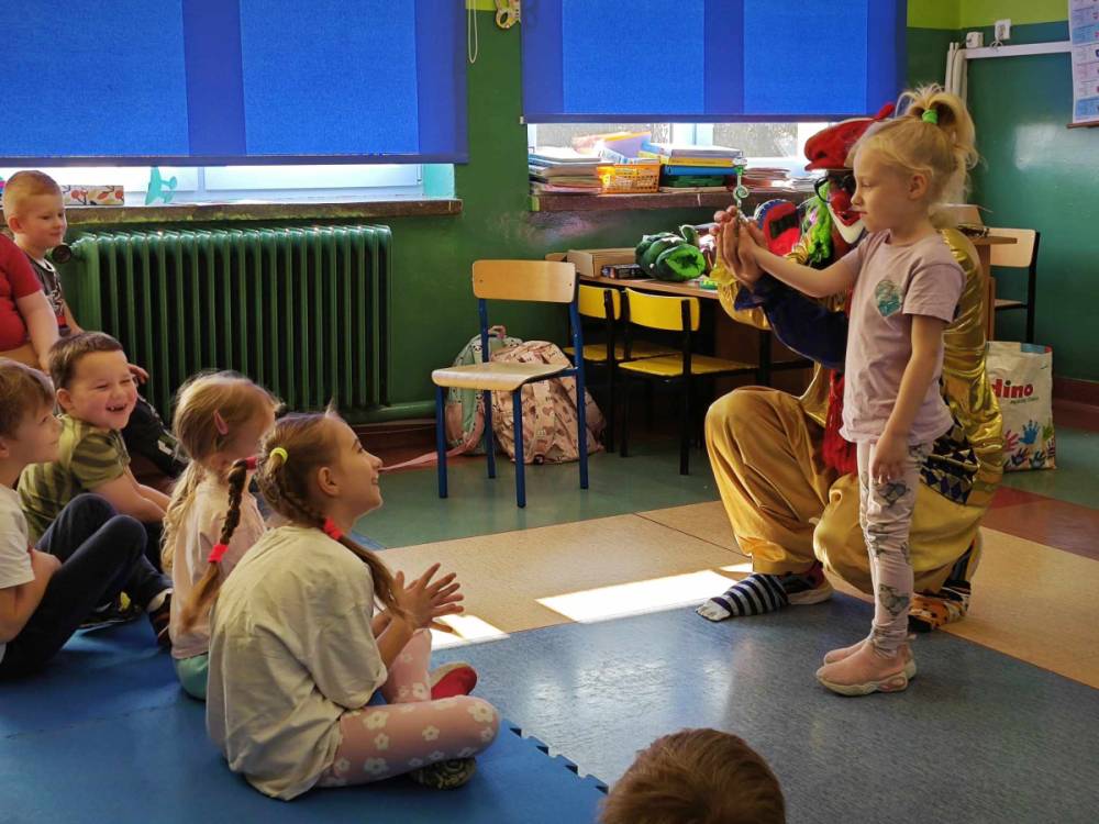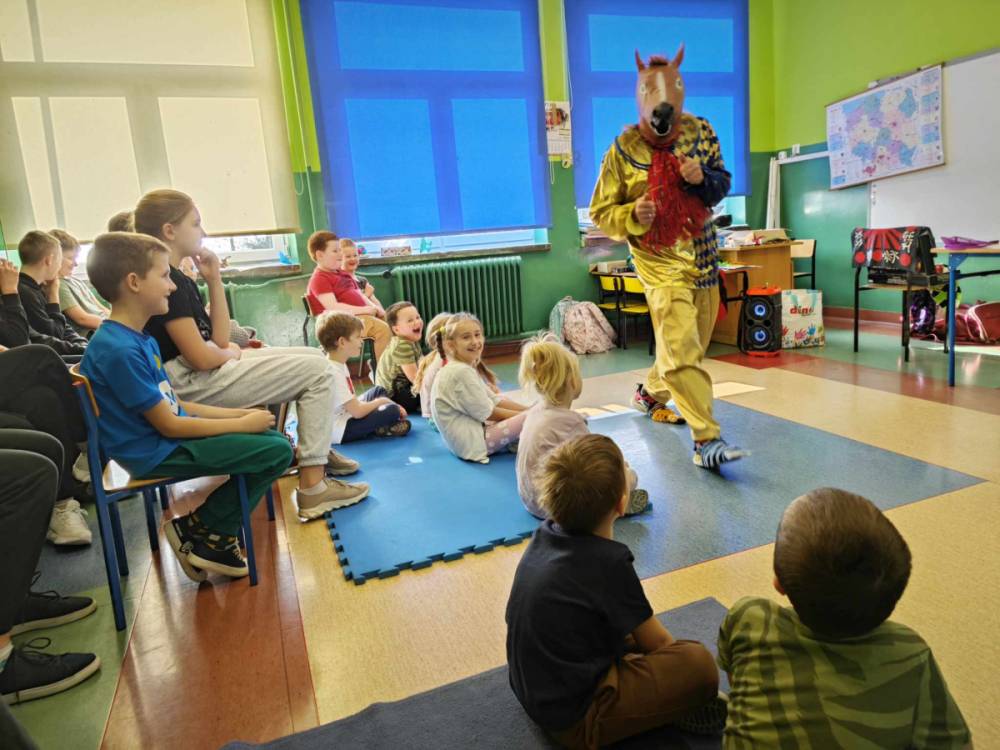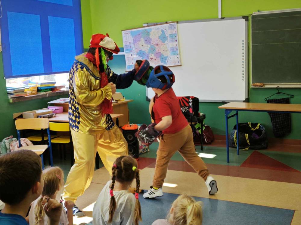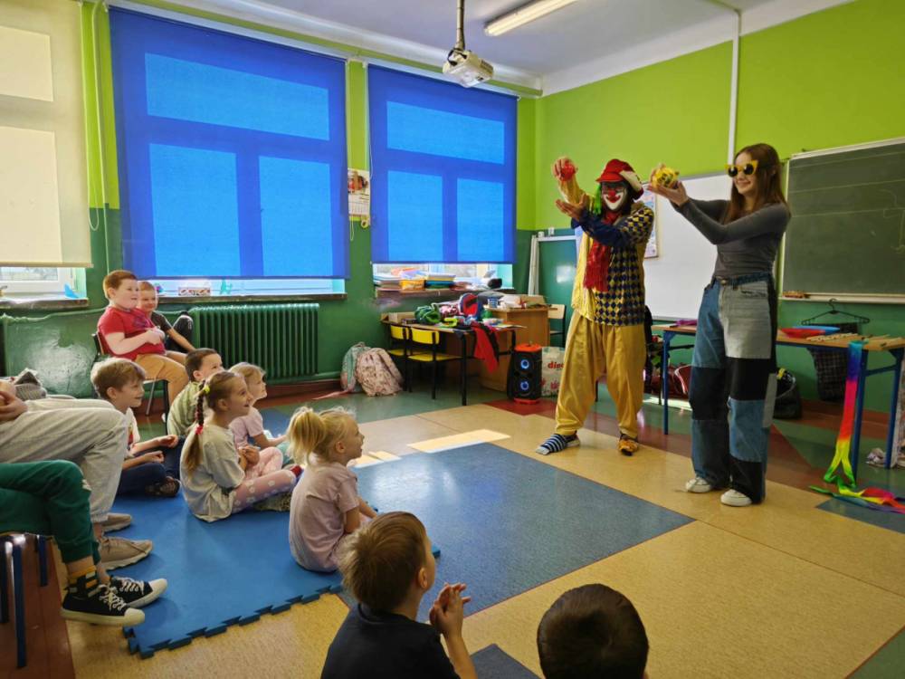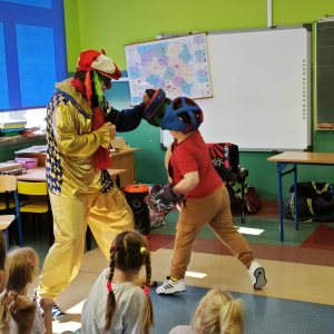 Występ klauna Waldusia połączony był z pokazem ciekawych sztuczek i miał na celu rozbawienie dzieci. Program wypełniony był dynamicznymi scenkami, sztuczkami, eksperymentami, zagadkami oraz muzyką. Prezentowane przez klauna zabawy cyrkowe rozwijają koordynację ruchową, wyobraźnię oraz kreatywne myślenie. Klaun angażował do zabawy większość uczniów oraz nauczycieli, nagradzając ich słodkimi upominkami. Dziękujemy Klaunowi Waldusiowi za kolejny, bardzo interesujący program, podczas którego dzieci mają okazję nie tylko się bawić, ale również nabywać nowe umiejętności.