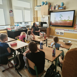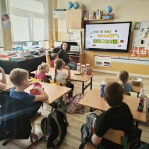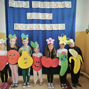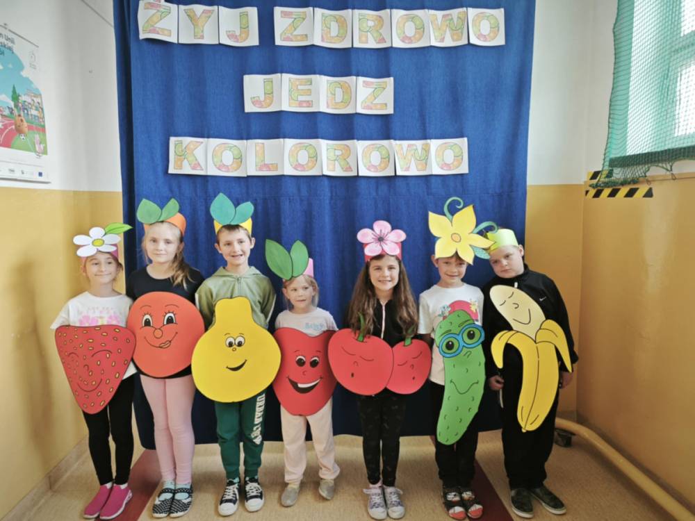 W ramach realizacji ogólnopolskiego projektu „Skąd się biorą produkty ekologiczne” nasi najmłodsi wychowankowie oraz uczniowie klasy I w barwnych strojach wierszem i piosenką przybliżyli nam zasady zdrowego stylu życia. W ramach realizacji zadań zawartych w projekcie w ciągu roku dzieci poznały zdrowe produkty oznaczone symbolem EKO – produktu zielonym listkiem, analizowały, „Piramidę Zdrowego Żywienia”, wyrażając swoje preferencje żywieniowe, dowiedziały się, czym jest „śmieciowe jedzenie” i jak cukier szkodzi zdrowiu, uczyły się dokonywania prawidłowych wyborów dotyczących codziennego żywienia oraz komponowania zdrowych posiłków.